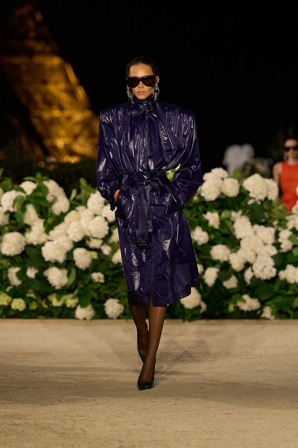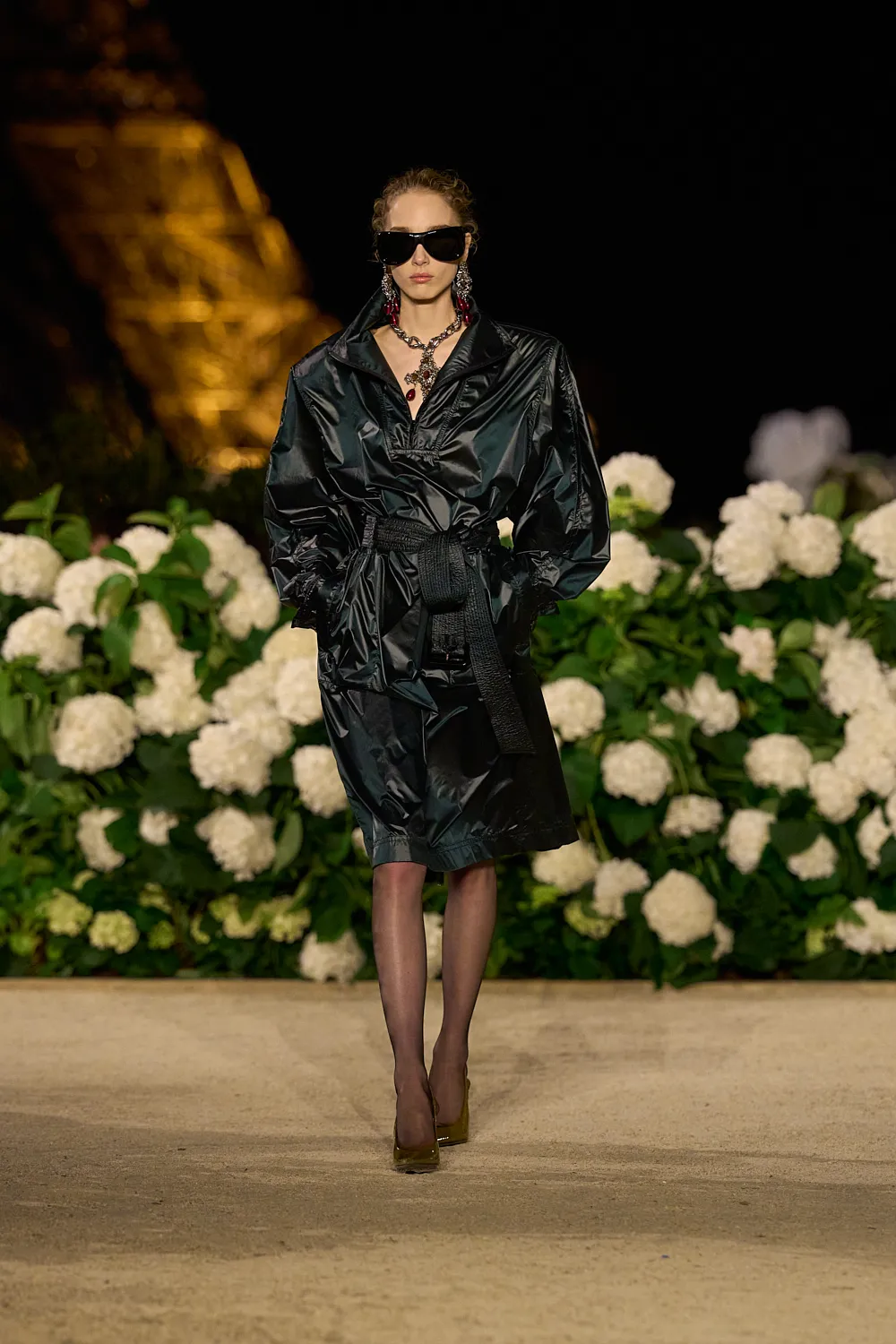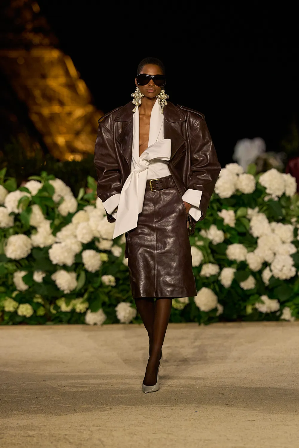 Mở màn là váy bút chì da ôm sát đi cùng sơ mi trắng buộc nơ lớn, phủ ngoài áo aviator gồ ghề. Trên nền ánh sáng tháp Eiffel, hình ảnh ấy gợi nhớ nữ chính trong điện ảnh Pháp cổ điển, mạnh mẽ nhưng vẫn mong manh. Vaccarello tiếp tục khai thác chất liệu: trench coat nylon siêu nhẹ, váy safari xuyên thấu, sơ mi voan in họa tiết, khắc họa người phụ nữ đa diện, vừa thám hiểm, vừa nổi loạn, vừa lãng mạn.