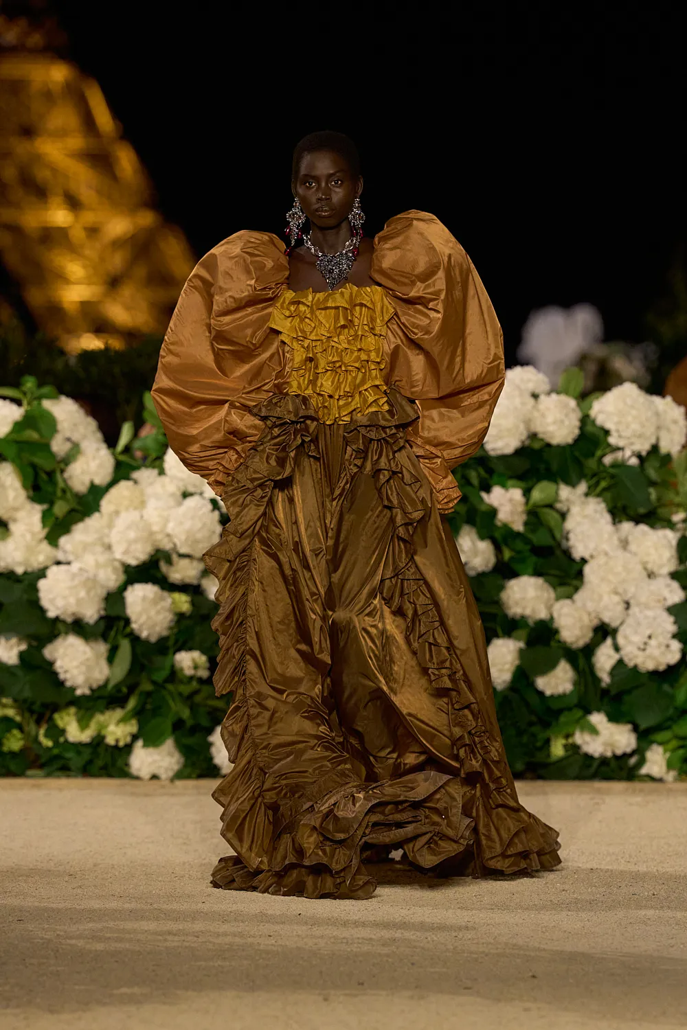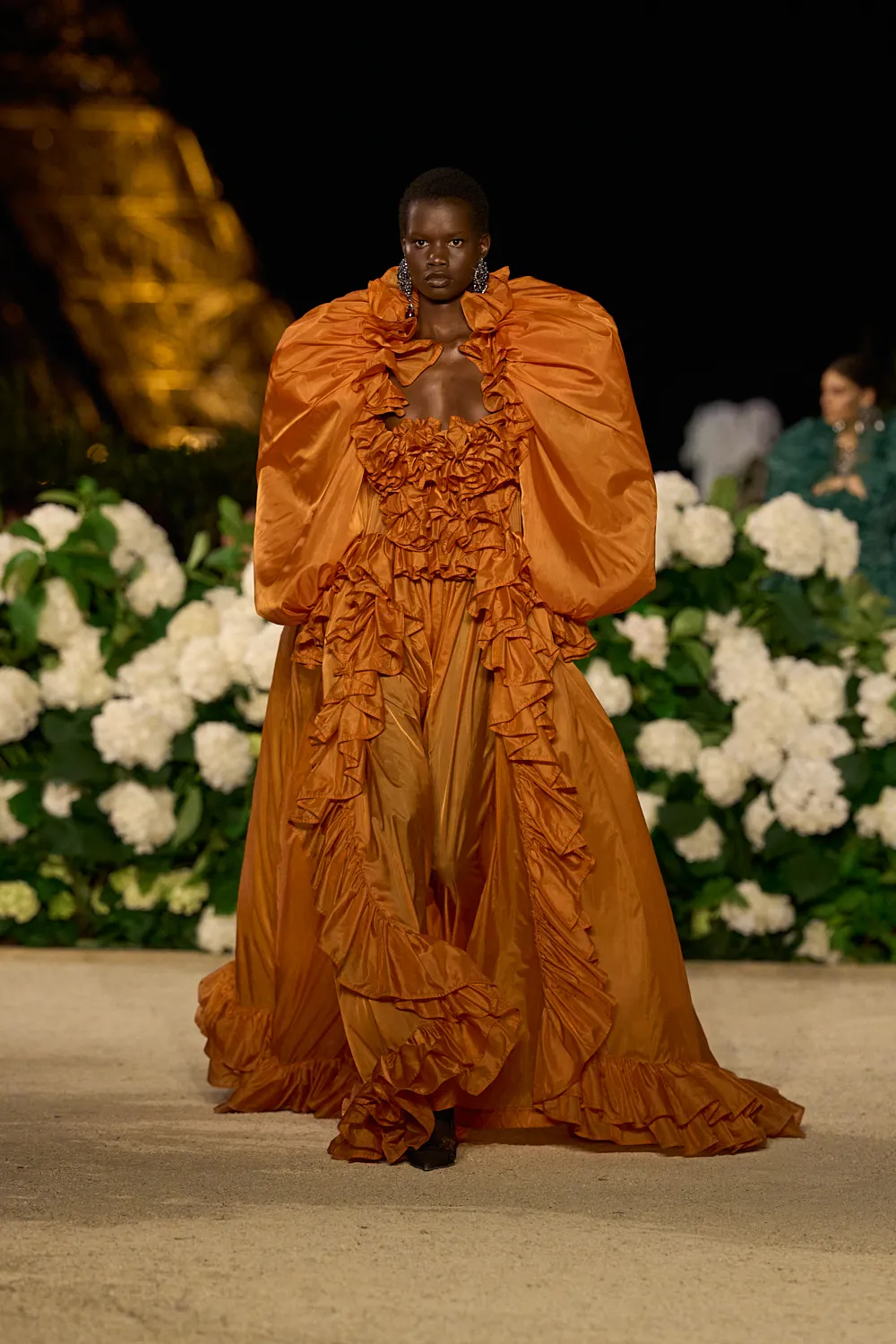Đỉnh điểm nằm ở eveningwear: váy cut-out, vai phồng điêu khắc, bèo nhún bất đối xứng. Bảng màu thiên về nâu đất, xám khói, nhấn bằng đỏ và vàng marigold. Phụ kiện tiết chế nhưng mạnh mẽ: khuyên tai chandelier, kính che mặt, boots gót nhọn. Cao trào đến khi Bella Hadid xuất hiện trong váy marigold với cầu vai vuông, vẽ nên hình ảnh nữ anh hùng màn bạc, kiêu hãnh và bất khả xâm phạm.