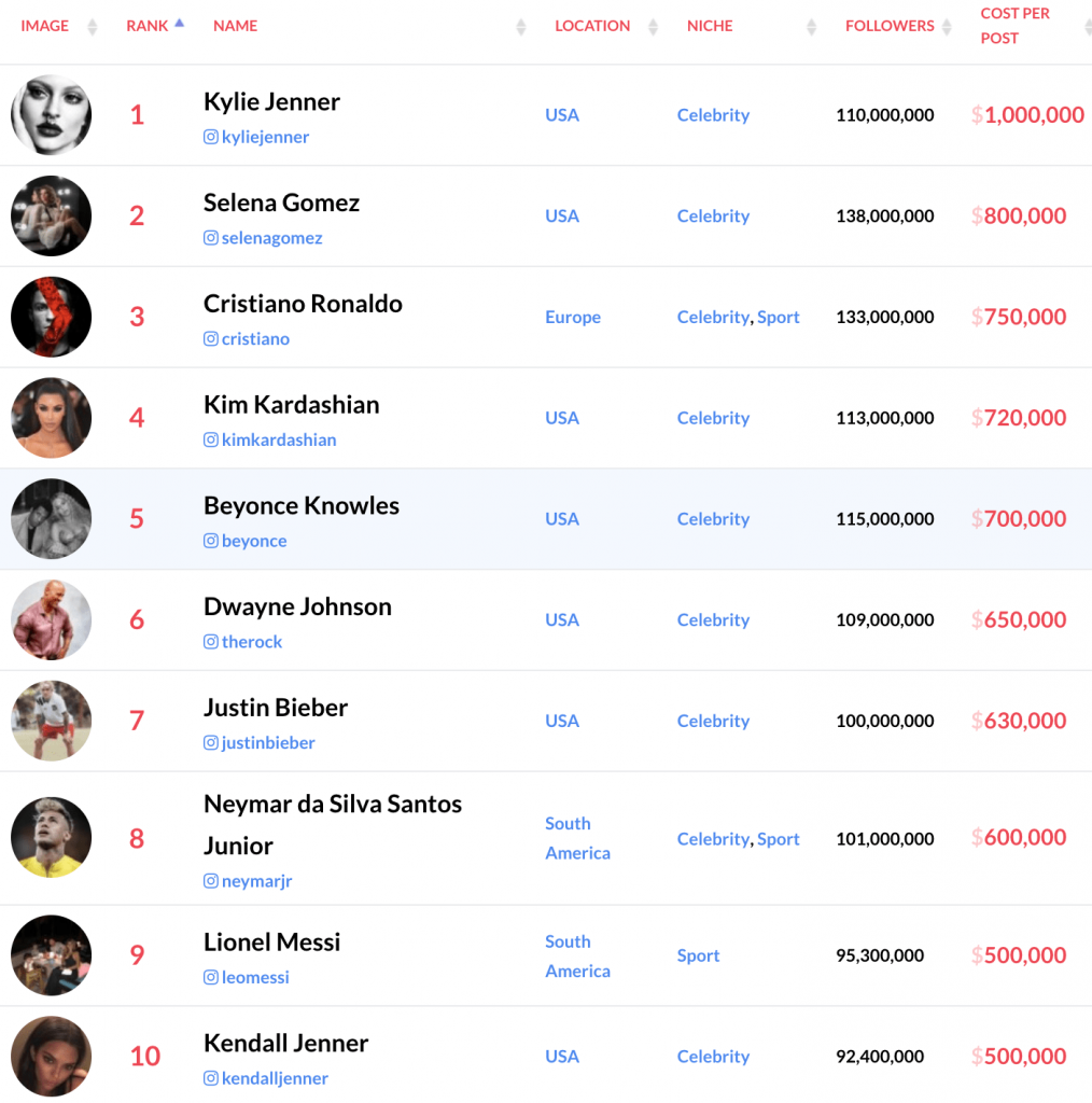 Các vị trí tiếp theo trong top 5 người được trả tiền quảng cáo cao nhất trên Instagram năm 2018 là ngôi sao bóng đá Cristiano Ronaldo (750 nghìn đô/bài đăng), Kim Kardashian (720 nghìn đô/bài đăng) và “Ong chúa” Beyoncé (700 nghìn đô/bài đăng).