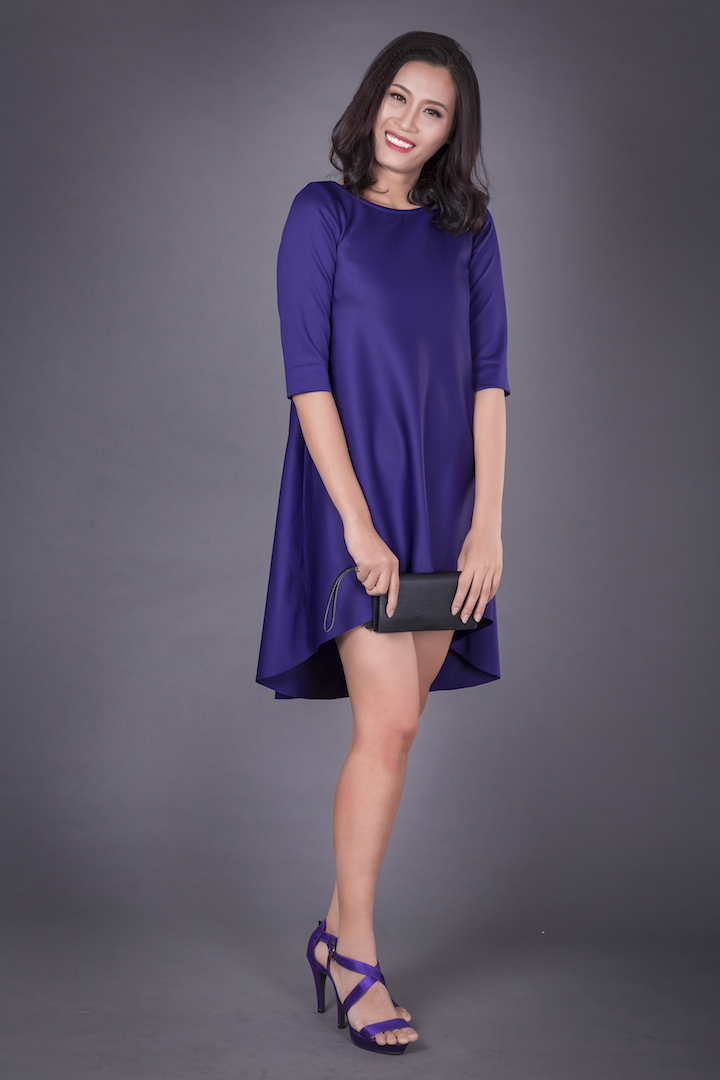 Hoặc đầm tím vạt xéo vừa hiện đại, vừa tươi mới.