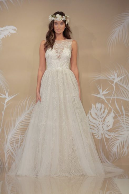 Trái ngược với những thiết kế phổi biến là dùng lớp vải xuyên thấu ở phần thân trên và váy kín ở dưới, Monique Lhuillier mang đến nét phá cách cho chiếc váy cưới của mình với phần đắp ren trên ngực tinh tế cùng lớp váy sheer xuyên thấu giúp cô dâu khoe đôi chân dài thon thả.