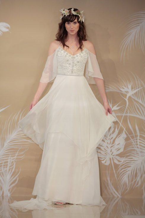 50. Váy cưới trễ vai màu nude của Marchesa Bridal