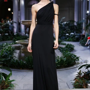 BST Xuân-Hè 2017 của Caroline Herrera mở đầu với một chiếc váy dạ hội bằng denim với những đường chiết eo mạnh mẽ đối lập với những mảng bèo rủ mềm mại. Nếu có ai đó có thể khéo léo đưa những chi tiết bằng denim vào những chiếc đầm sang trọng thì đó chỉ có thể là Caroline Herrera.