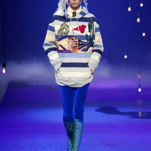Món đồ thể thao quen thuộc: áo hoodie biến hóa đa sắc màu trong những thiết kế của Baptista. Từ những chiếc váy hoodie thoải mái, phóng khoáng như bước ra từ bãi biển cho tới những thiết kế nữ tính nhờ những điểm nhấn ở eo.