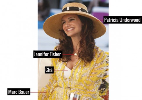 Miranda: đầm họa tiết lạ của Mara Hoffman, vòng tay của Roberto Cavalli.