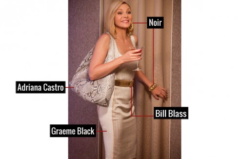 Carrie: Đầm Vintage Halston, áo hai dây của Stella McCartney, thắt lưng Reem Acra, túi Bea Valdes và giày cao gót của Manolo Blahnik.