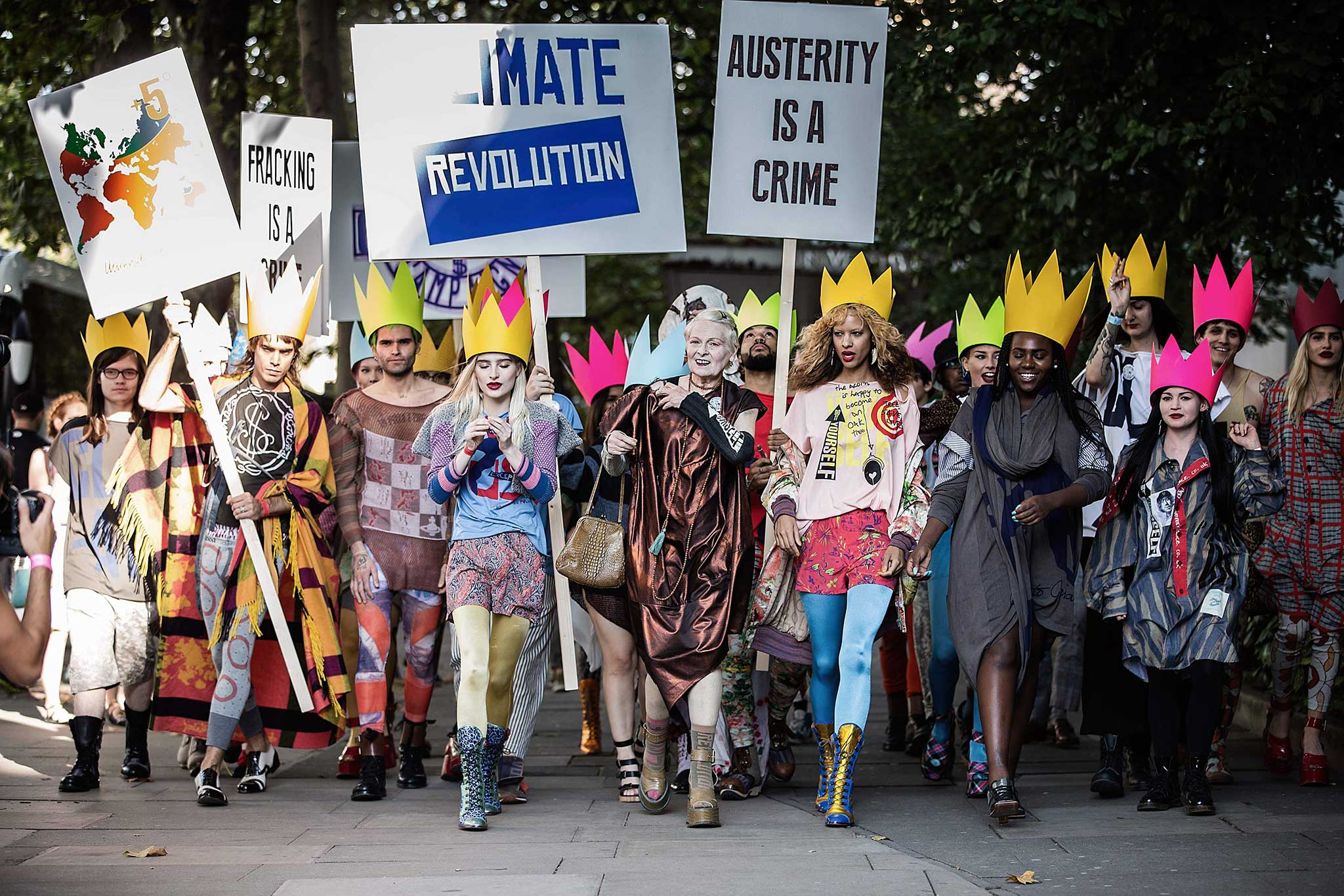 Vivienne Westwood đã biến chuyển cả sàn diễn tại tuần lễ thời trang London thành cuộc cách mạng thời trang xanh. (Ảnh: climaterevolution.co.uk)