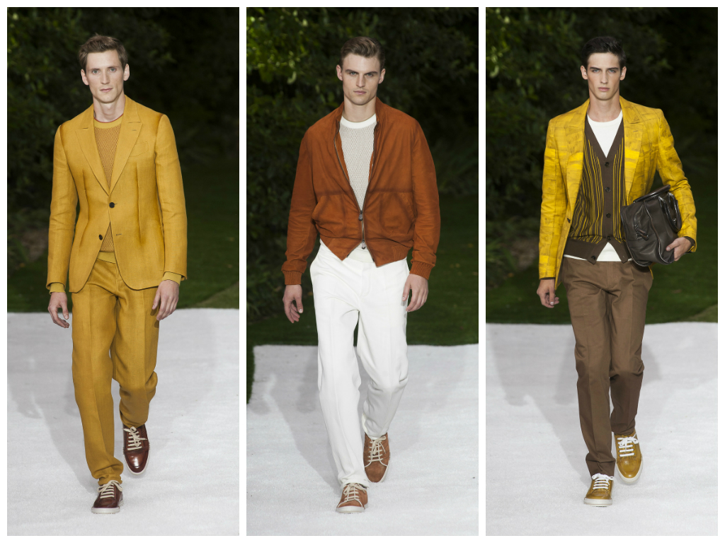 Chất liệu chính được sử dụng là da thuộc cao cấp, lụa và linen – đảm bảo một độ bền lâu năm. Không đi theo xu hướng màu sắc rực rỡ mùa hè, Alessandro chọn tông màu nền nã, tự nhiên như nâu đất, vàng hướng dương, xanh rêu, tím đậm mang đậm chất nam tính.