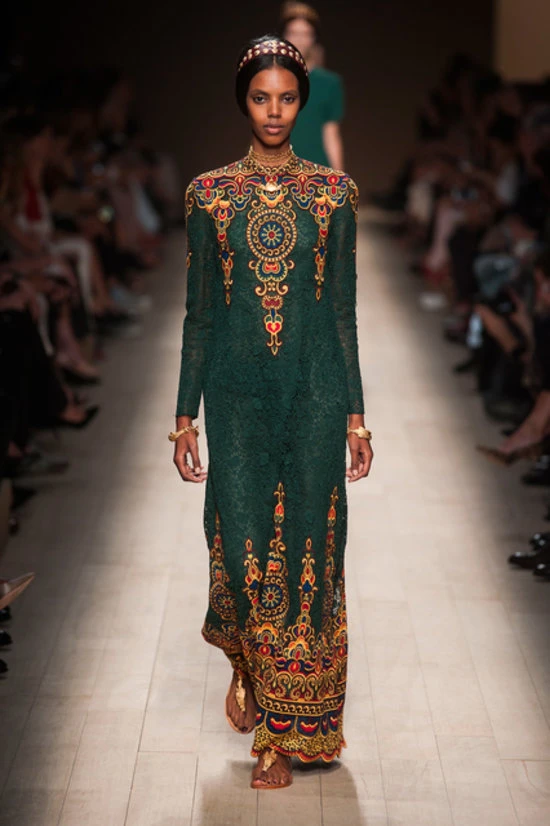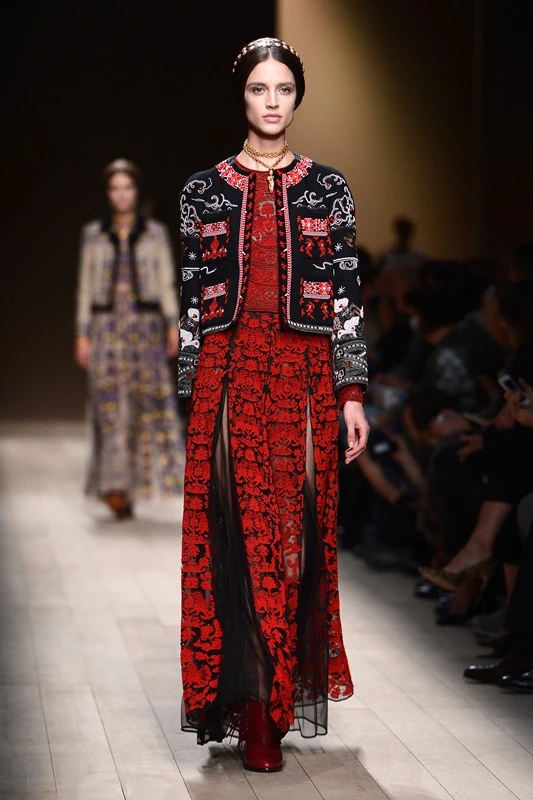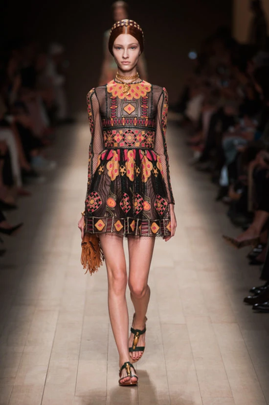Điểm nổi bật nhất trong BST là những đường hoạ tiết nghệ thuật được thêu bằng tay một cách tinh xảo trên mặt vải bóng đơn giản, thể hiện sự tinh tế mà vẫn giữ được nét sang trọng cần có. Ngoài ra phải nói tới nghệ thuật in hoạ tiết của những người thổ dân lên quần ống rộng hay váy ngắn, chân váy dài lấy cảm hứng từ phong cách thời phục hưng. Với mái tóc được chải đều về phía sau đi kèm với vương miện, tất cả đều làm bạn lầm tưởng rằng bạn đang xem một bức tranh nghệ thuật phác họa những nàng công chúa kiều diễm thời xa xưa.
