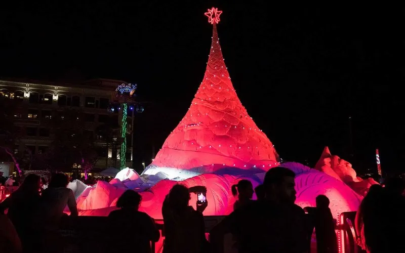 Thoạt nhìn, du khách sẽ nghĩ cây thông trắng này được treo lơ lửng trên không, nhưng thật ra, đây chỉ là hình ảnh ba chiều được chiếu trên tấm màn trắng. Đây là sản phẩm của một công ty thiết kế ở Amsterdam, nó cho phép người điều khiển đổi màu hay thay đổi vị trí của hình ảnh.