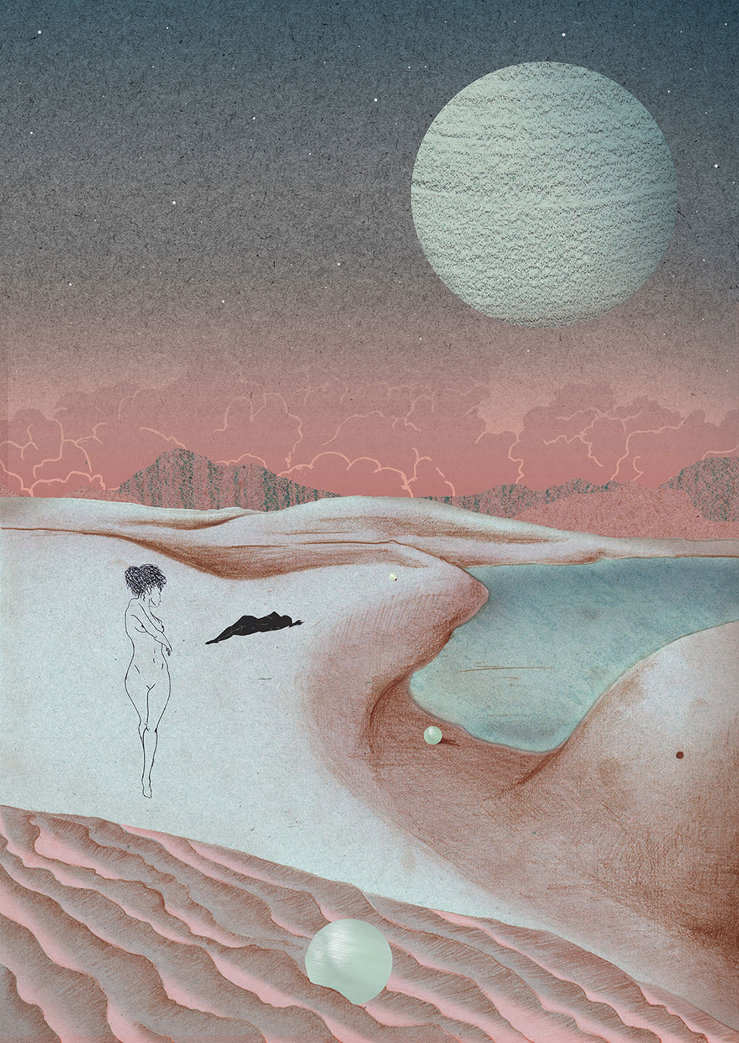 Không gian kiến trúc “mở” trong tranh của Charlotte Edey dù vẫn vuông vức, góc cạnh nhưng không hề thô cứng mà ngược lại, vô cùng mong manh và dịu dàng. Trên phông nền thơ mộng đó, con người (mà cụ thể là người phụ nữ) xuất hiện nhỏ bé, lãng đãng, tận hưởng và kết nối với không gian. Bên cạnh chủ thể “tôi” – cô gái da màu có ngoại hình giống Charlotte Edey, luôn xuất hiện trong tranh, một số chi tiết khác cũng thể hiện sự nữ tính như hình ảnh đôi bàn tay, viên ngọc trai màu trắng, chiếc ghim bấm hay những giọt nước trong vắt… Xem tranh của Charlotte Edey, chúng ta dễ để lòng mình trôi vào một không gian mơ màng, ngọt ngào và hết sức gợi mở.