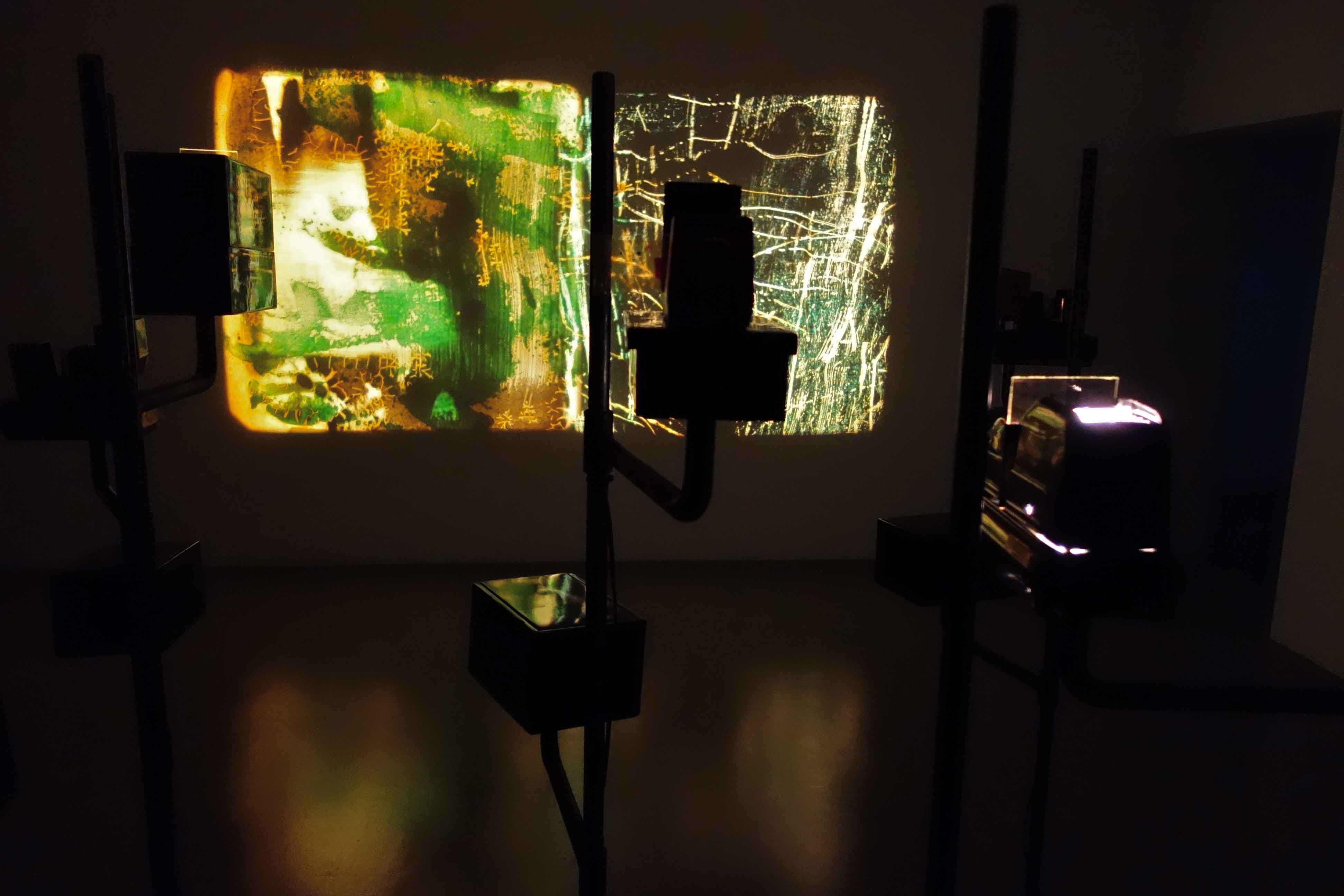Hai tác phẩm này, dù có vẻ như không liên quan tới nhau, thực ra đều thể hiện việc thay đổi quy mô và ý đồ. Specula phóng đại một bức tranh sơn mài có kích cỡ của một “toan vẽ” truyền thống nhằm tạo ra một không gian vật lý, đồng thời tìm hiểu những dạng thức hình ảnh khác nhau có thể tạo ra nhờ sự phong phú của chất liệu sơn mài. Trong khi đó, Palimpsest làm đảo lộn quy mô và định nghĩa về tranh sơn mài bằng cách đặt nó vào trong một tấm kính, trên một màn hình, và “nhìn” thông qua hệ thống thấu kính sơn mài. Hai tác phẩm này đều là những tuyên ngôn về sơn mài và giới thiệu khá rõ về công việc của tôi.