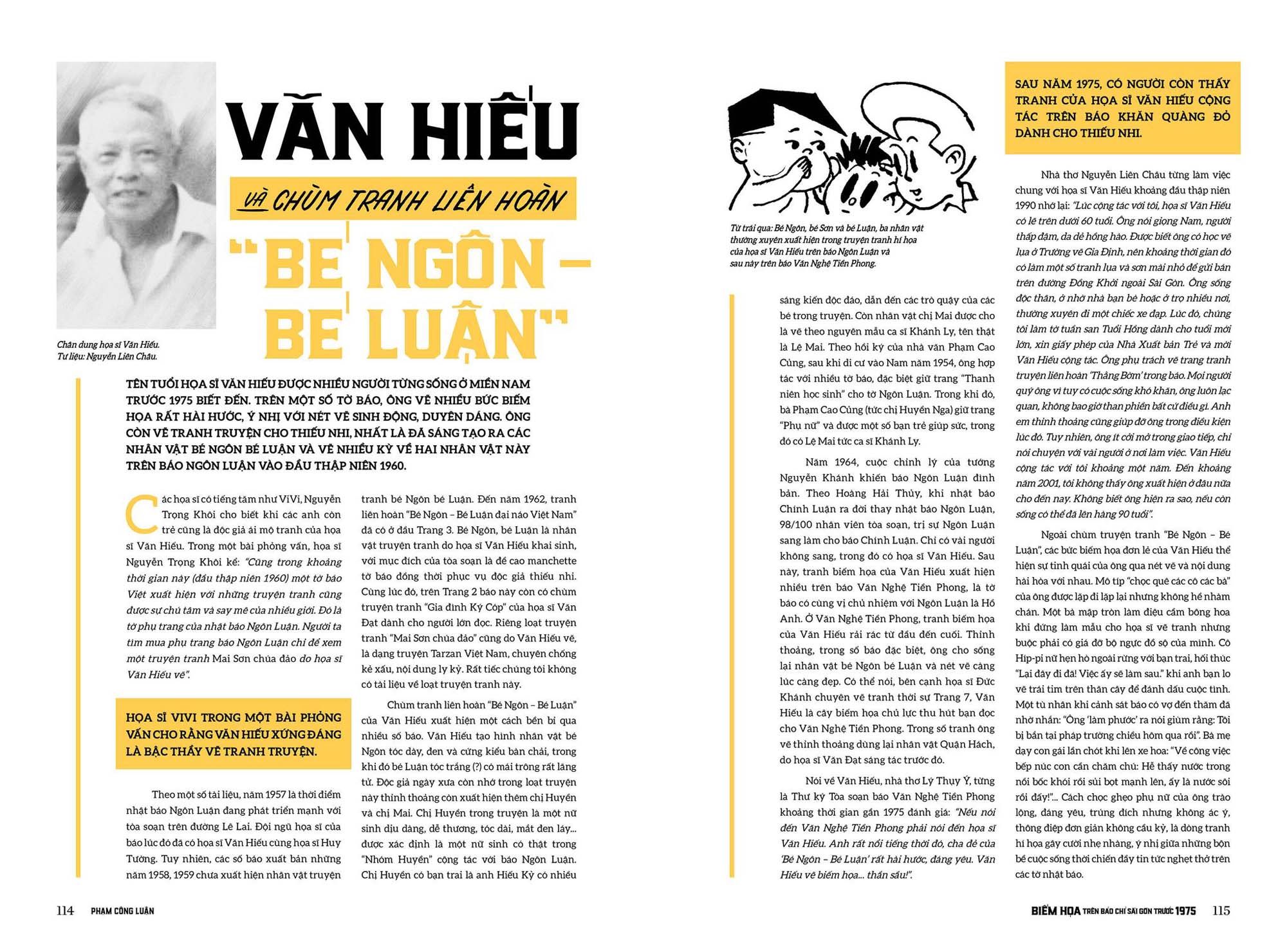 Hay tên tuổi họa sĩ Văn Hiếu được nhiều người từng sống ở miền Nam trước 1975 biết đến. Trên một số tờ báo, họa sĩ vẽ nhiều bức biếm họa hài hước, ý nhị với nét vẽ sinh động, duyên dáng. Nói về Văn Hiếu, nhà thơ Lý Thụy Ý, từng là Thư ký Tòa soạn báo Văn Nghệ Tiền Phong khoảng thời gian gần 1975 đánh giá: “Nếu nói đến Văn Nghệ Tiền Phong phải nói đến họa sĩ Văn Hiếu. Anh rất nổi tiếng thời đó, cha đẻ của ‘Bé Ngôn – Bé Luận’ rất hài hước, đáng yêu. Văn Hiếu vẽ biếm họa… thần sầu!”.