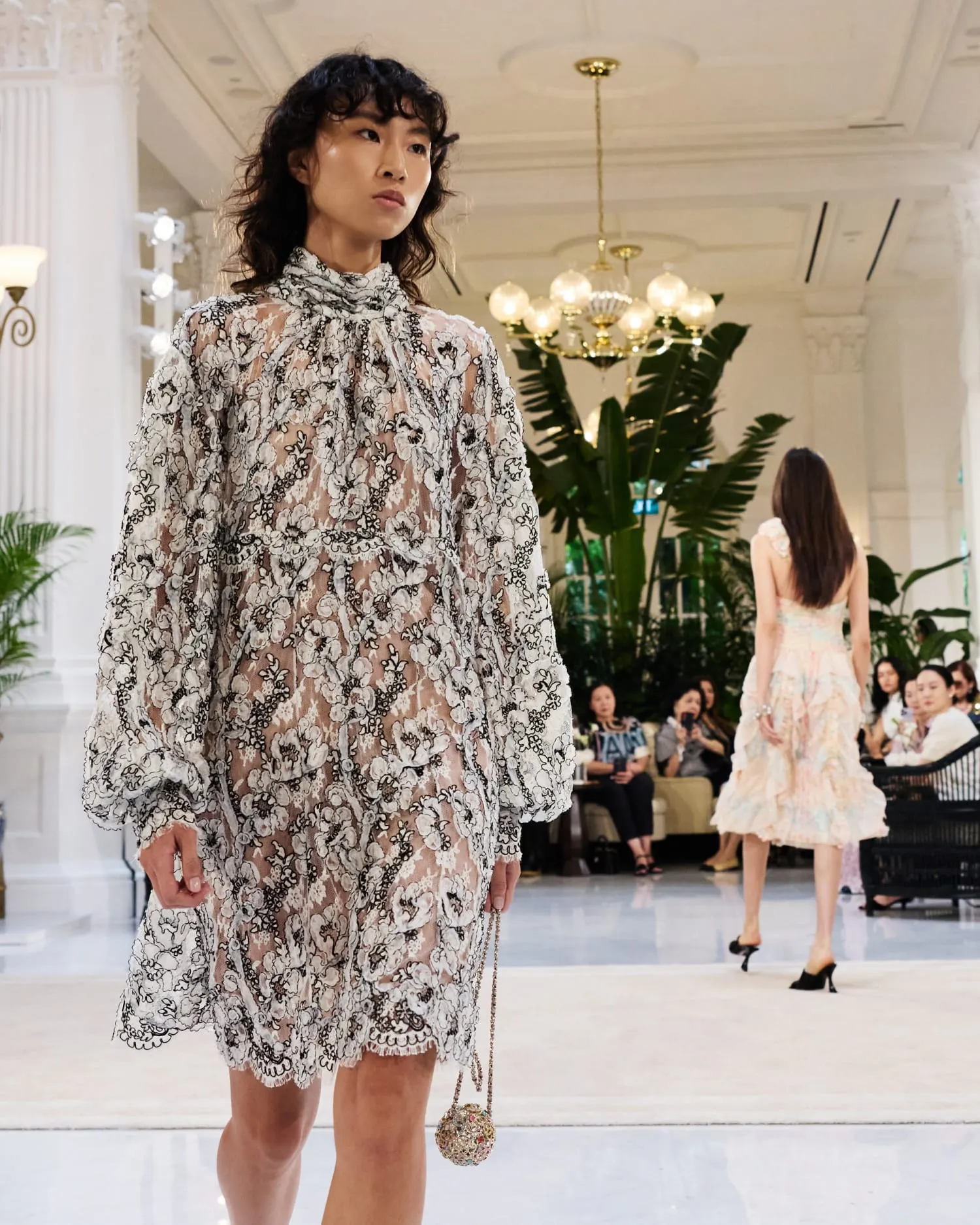Tại Raffles Hotel, buổi trình diễn đã chọn một hình thức trình diễn thân mật, khước từ sàn catwalk truyền thống. Thay vào đó, các người mẫu nhẹ nhàng lướt đi giữa những chiếc bàn nhỏ và hàng ghế sang trọng nơi sân trong khách sạn. Lấy cảm hứng từ đời sống khách sạn, bộ sưu tập Chanel Cruise 2025/26 tôn vinh niềm vui mặc đẹp bất kể thời điểm nào trong ngày.