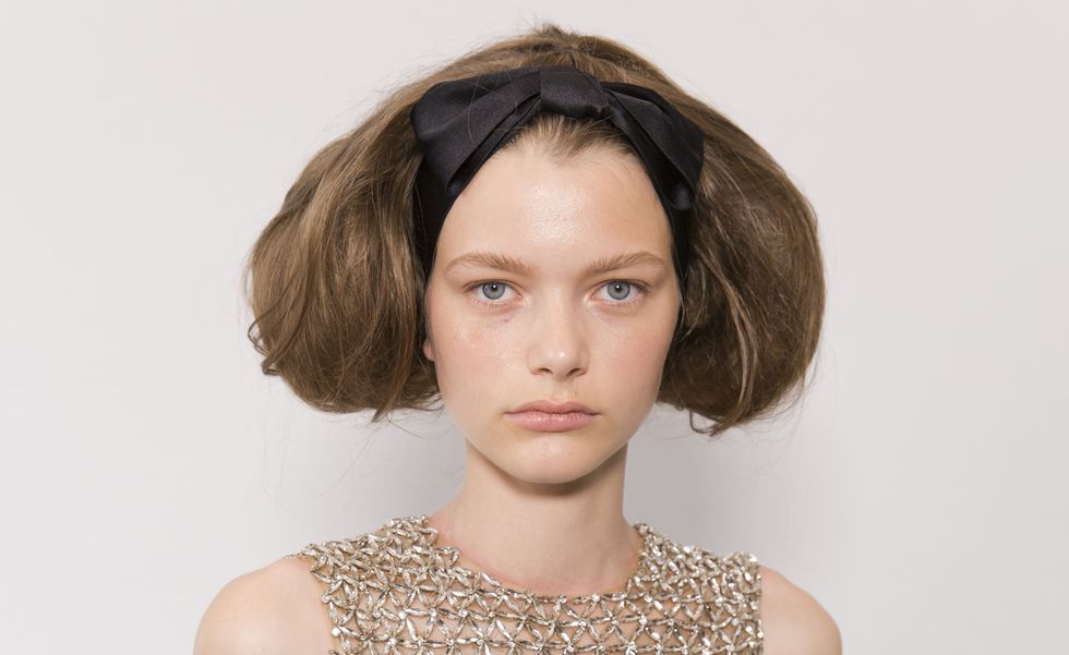 Những cô người mẫu trên sàn diễn của Giambattista Vallii có một điểm chung là mái tóc được kẹp phồng, tạo ảo giác trông như họ đều có kiểu tóc bob ngắn. Điểm nhấn thú vị ở đây là chiếc băng đô nơ màu đen có màu tương phản với những bộ đầm nữ tính.