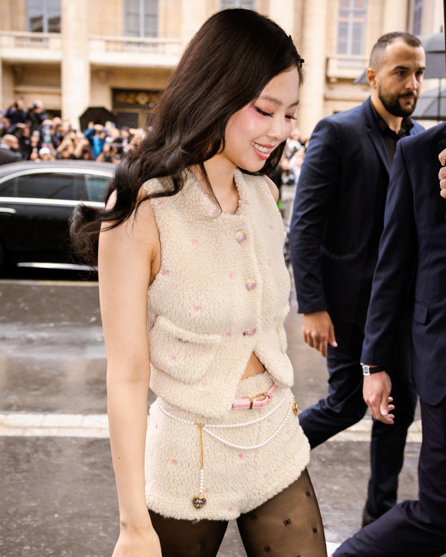 Là đại sứ “hàng thật giá thật”, Jennie vẫn luôn chiếm trọn mọi ánh nhìn tại bất kỳ sự kiện nào của Chanel. Nhà mốt hoa trà luôn dành sự ưu ái đặc biệt cho “nàng Chanel sống”. Tại buổi diễn này, Jennie diện bộ trang phục màu kem trắng với áo gile và quần short bằng lông, phối cùng thắt lưng bản nhỏ. Như thường lệ, bên cạnh vị trí ngồi ở hàng ghế front-row quyền lực, toàn bộ set đồ này đều được Chanel thiết kế riêng cho cô nàng.