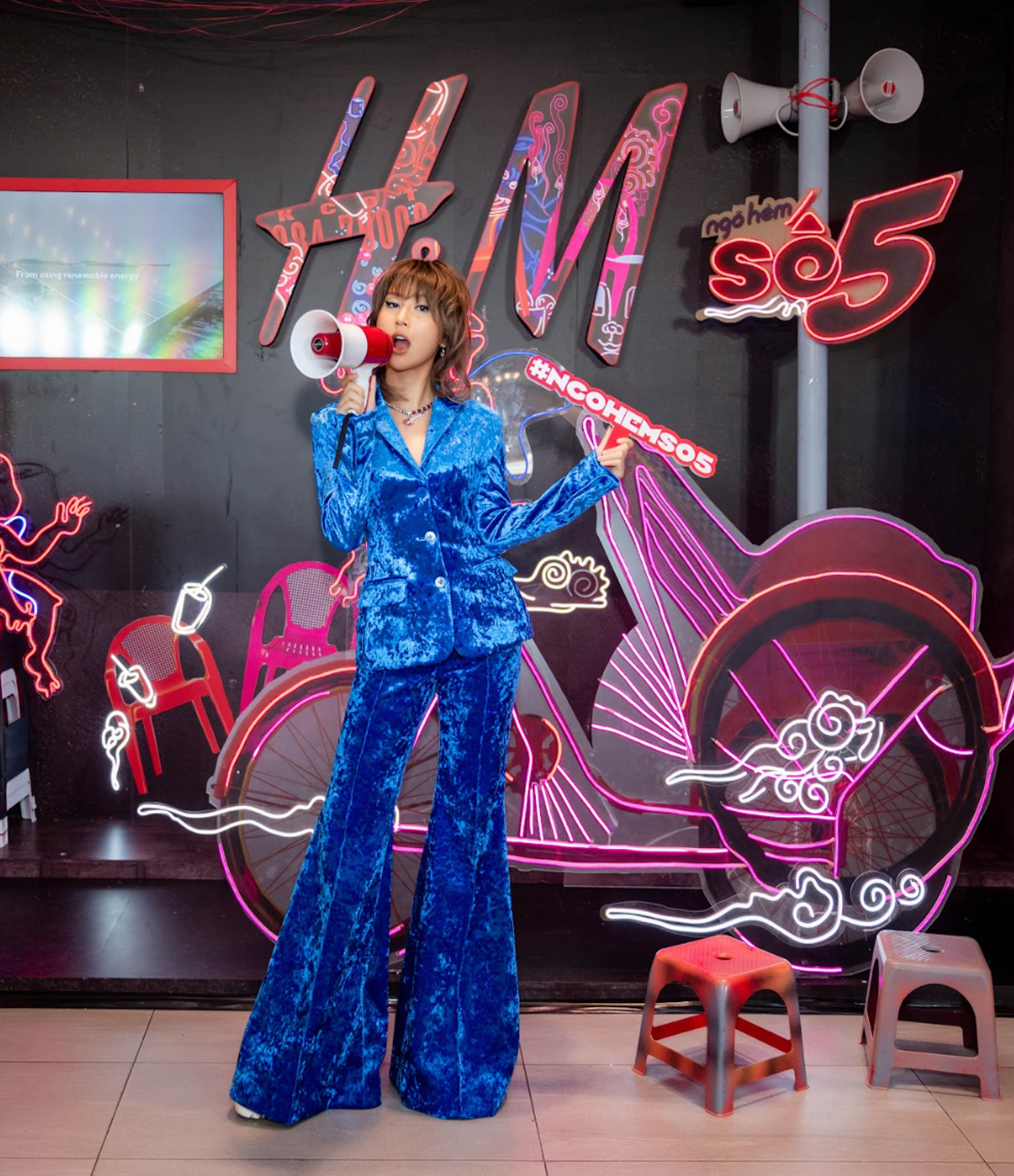 Tại cửa hàng H&M Đồng Khởi, nghệ sĩ Tùng Monkey đã khéo léo đưa vào hàng loạt biểu tượng rất đỗi quen thuộc với người Việt, từ xe máy, xích lô, ghế nhựa đến quán xá ven đường. Tất cả đều được bao phủ trong tông màu đỏ và hồng neon chủ đạo càng tôn lên hiệu ứng thị giác mạnh mẽ. Từ ngày 9 – 11/9, bạn có thể “check in” Ngõ Hẻm số 5 của H&M như hàng loạt tín đồ thời trang, KOL đình đám, trong đó phải kể đến fashionista Quỳnh Anh Shyn, blogger An Phương, beauty blogger Chloe Nguyễn, fashionista Thu Anh Hồ, hay người mẫu Linh Chi…
