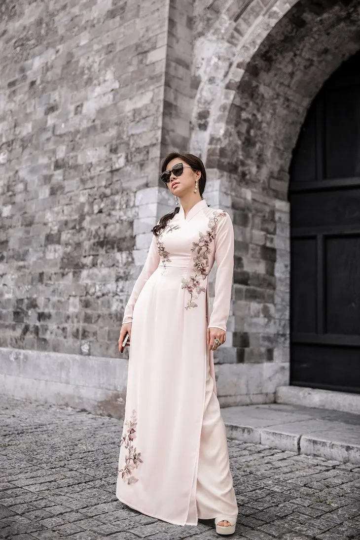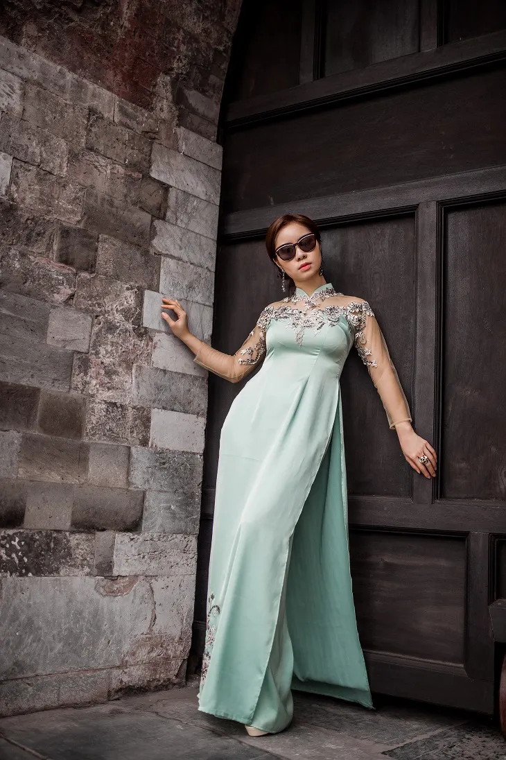 Chiếc áo dài truyền thống thêm sang trọng với trang trí thêu hoa tinh tế trên nền lụa xanh bạc hà thanh thoát.