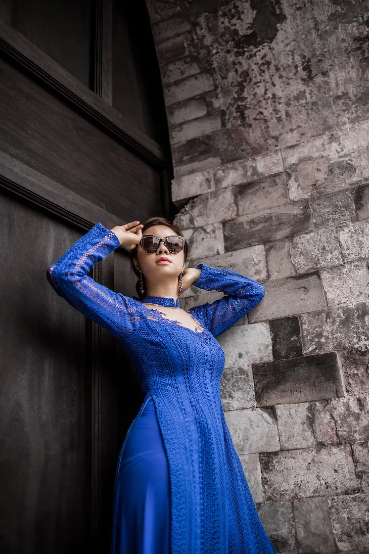 Chất liệu ren hiện đại cũng được ứng dụng sáng tạo trong mẫu áo dài xanh coban thanh lịch…