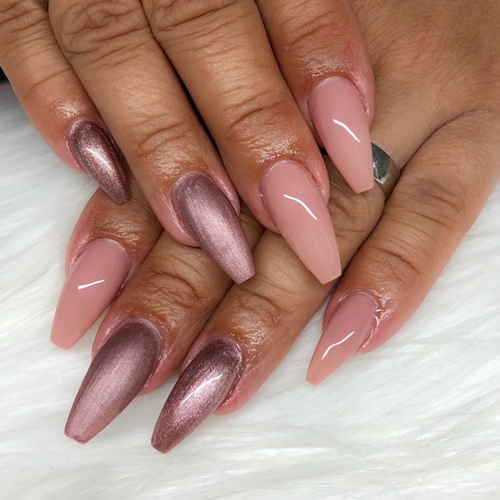 Màu hồng vỏ đỗ đã khuấy đảo giới làm đẹp và thời trang trong suốt năm vừa qua. Bạn có thể tạo điểm nhấn cho bộ móng của mình bằng một hai móng màu hồng kim loại (metallic) trên mỗi bàn tay.