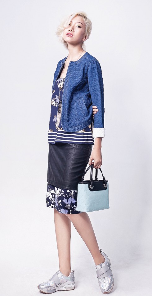 Ngày: Set đồ denim ton sur ton với áo khoác, chân váy, túi xách và giày trông thật hài hòa, làm tôn lên vóc dáng thanh mảnh của bạn. Cùng với phụ kiện kính mắt tông xanh và áo top-crop tông vàng, trông bạn thật cá tính và nổi bật.