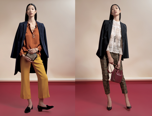 Trái: Áo, quần DKNY, áo khoác của stylist, Túi Furla, Giày Aldo, Hoa tai Topshop – Phải: Áo khoác BCBG Maxazria, Clutch Charles & Keith, Hoa tai Topshop, Giày Aldo