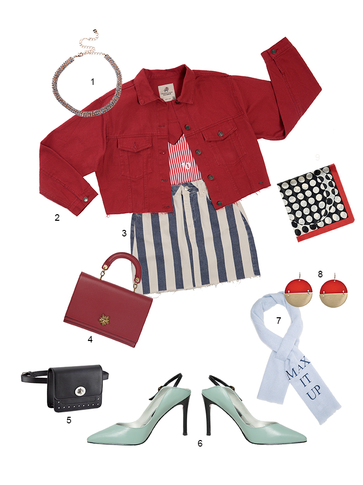 Chất liệu denim cũng vô cùng thời trang trong sắc màu đỏ hay đen. Tạo sự liên kết giữa áo khoác với túi xách hoặc đôi hoa tai tròn màu đỏ để trông thật sáng tạo và sành điệu.