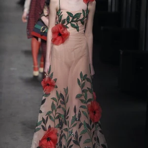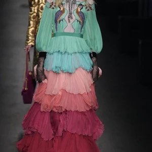 Alessandro Michele vẫn chuộng những chi tiết thêu, đính cầu kỳ trong BST lần này. Chiếc đầm kim sa màu xanh cổ vịt với hoạ tiết cá vàng mang gợi tới những chiếc sườn xám cổ điển của Trung Quốc.