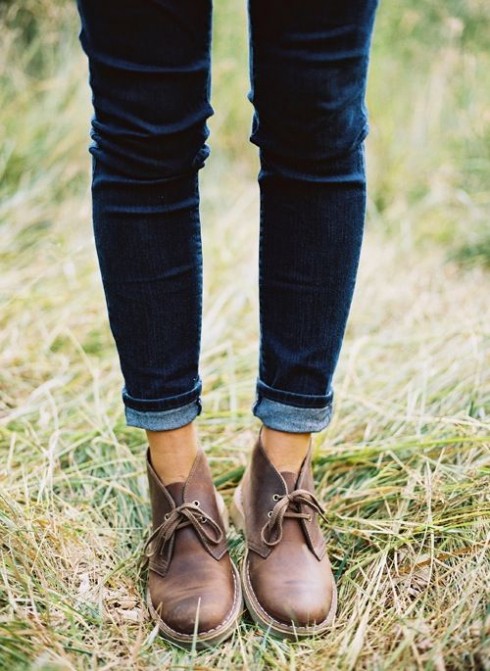 Với giày dép kết hợp cùng jeans xếp gấu thì bạn nên chọn càng đơn giản càng tốt. Chất liệu dày như jeans, kể cả là loại jeans vải mỏng cũng cần đến sự cân bằng hợp lý từ những đôi giày.