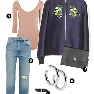 Công thức thường thấy nhất là Bomber jacket + t-shirt + jeans + giày thể thao. Đây là set đồ đơn giản nhưng không kém phần bụi bặm. Bạn hoàn toàn có thể biến hóa đa dạng khi thay thế sneakers bằng sandal đế bánh mỳ, giày cao gót, hay thay chiếc quần jeans đơn giản bằng chân váy.