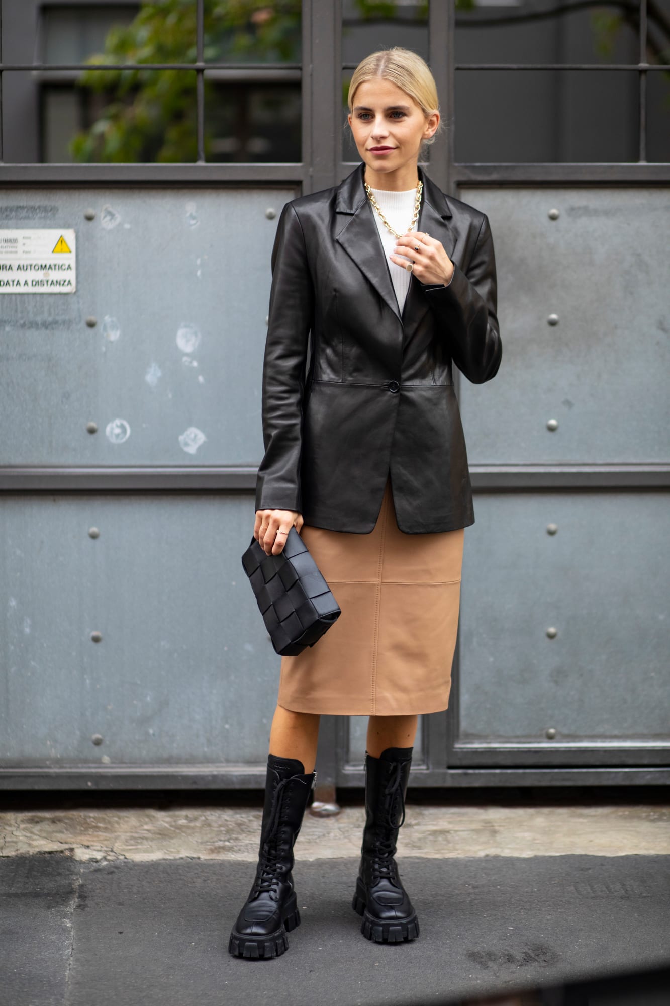 Màu trung tính vẫn là sự lựa chọn của nhiều fashionista. Điểm thắt ở eo tạo nên phom dáng nữ tính hiếm thấy ở những trang phục chất liệu da. Bên cạnh đó, đôi giày cùng màu với túi xách được kết hợp khéo léo. Phụ kiện hoa tai vàng bản lớn tạo điểm nhấn cho khuôn mặt, tạo ra một tổng thể dịu dàng, thanh lịch. (Ảnh: Melodie Jeng)Vẫn là cách phối một chất liệu “từ đầu đến chân” nhưng trang phục này có phần cá tính hơn với áo khoác oversized. Các chất liệu giả da hiện đại có nguồn gốc thực vật hoặc PU dễ xử lý khi nhuộm màu, tạo ra nhiều sự lựa chọn về màu sắc. (Ảnh: The Style Stalker)Bên cạnh đó, các fashionista cũng dễ dàng chọn những chất liệu da có độ lỳ, bóng khác nhau. Trang phục giả da cá sấu màu đỏ kết hợp chiếc túi “đa năng”. Vừa có thể dùng để đựng đồ, vừa là thắt lưng tạo điểm nhấn. (Ảnh: Melodie Jeng)Những chiếc áo khoác da thường gợi nhớ đến hình ảnh của những người trẻ liều lĩnh trên chiếc mô tô. Fashionista này như diện một biến tấu của “combo” áo khoác biker và kính aviator. Kính mắt vuông kết hợp áo khoác da xẻ tà nút lệch và giày bốt cùng chất liệu tạo nên tổng thể không thể “chất” hơn. (Ảnh: Fashionista)Bên cạnh những tông màu sặc sỡ, đỏ bordeaux cũng là màu sắc xuất hiện nhiều xuyên suốt sự kiện. (Ảnh: The Style Stalker)Phải chăng đây là sự “giao thoa” của mốt shorts suit và xu hướng đeo thắt lưng ở eo trên nền chất liệu da? Fashionista này chứng minh, ta hoàn toàn có thể trở nên cá tính trong những gam màu trung tính. Tổng thể trang phục sành điệu với những phụ kiện to bản và kính mắt độc đáo. (Ảnh: The Style Stalker)